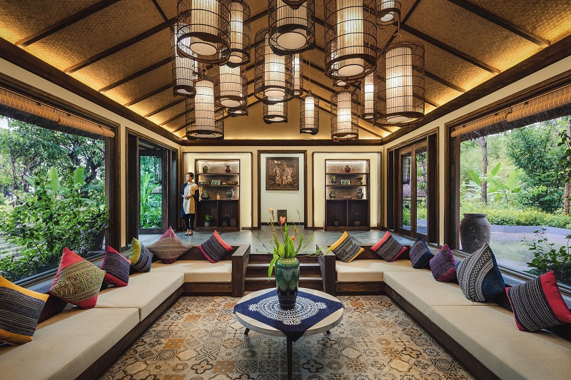4. Giống như các căn villa, sảnh chờ được thiết kế để đón nhiều nhất ánh sáng mặt trời. Nội thất bằng gỗ màu nâu sẫm, gối tựa với hoa văn thêu tay, các bình trang trí bằng sứ, và hoa dại cắm trong bình: tất cả những yếu tố này mang đến vẻ đẹp đơn giản nhưng tinh tế.